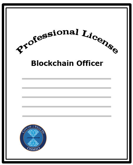For permissioned blockchain architectures, The City of Osmio Professional Licensing Department offers the Blockchain Officer’s